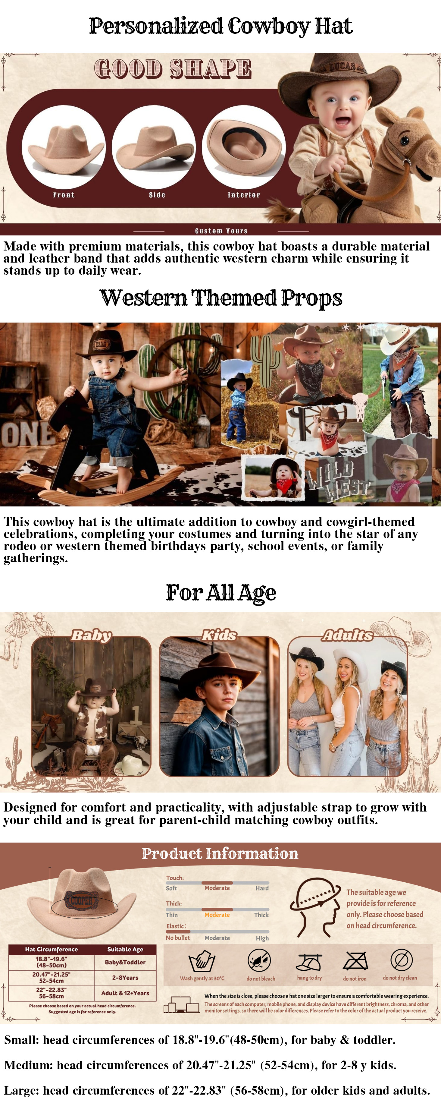 Personalized Cowboy Hat for Toddler Boys Girls, Western Hat for Kids Men Women, Custom Leather Patch Baby Cowgirl Hat